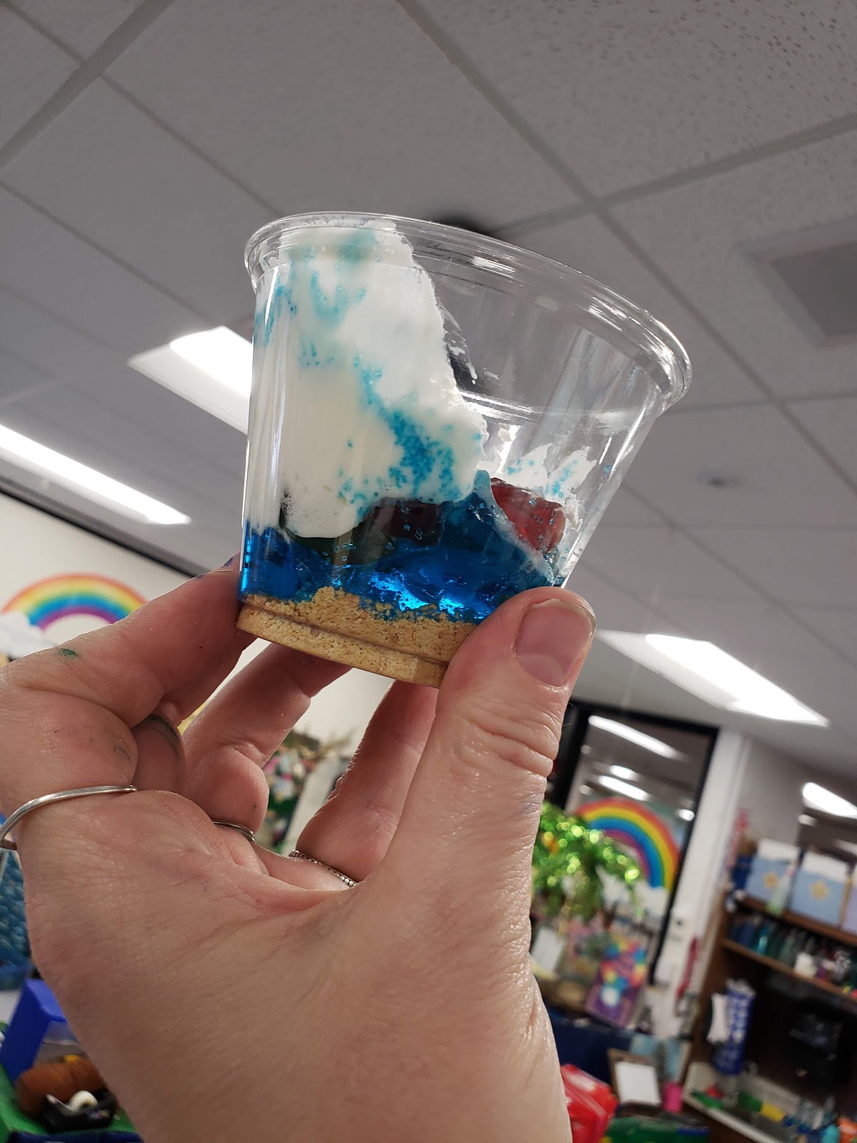 First we built the habitat... the ocean floor was graham crackers, the water was blue jello, and the waves were whipped topping and the sharks were gummies!